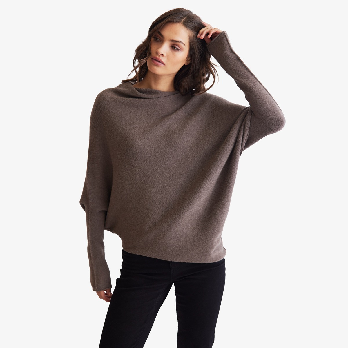 This slouchy knit sweater features a wide neckline, batwing sleeves, and an asymmetrical shape for a relaxed, cozy look. Lightweight and easy to layer, it adds effortless style to any casual outfit.