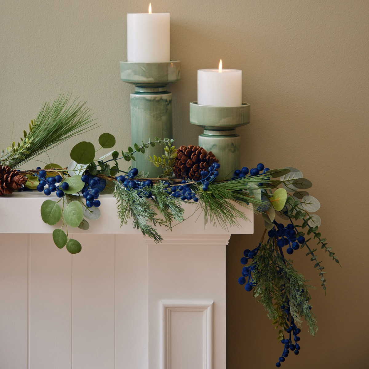 Transform your space with our Blueberry Garland. Featuring bunches of blueberries, silver dollas eucalyptus, pine cones and branches. This decorative garland is perfect for adorning mantels and staircases or will look equally impressive used as part of your festive tablescape.