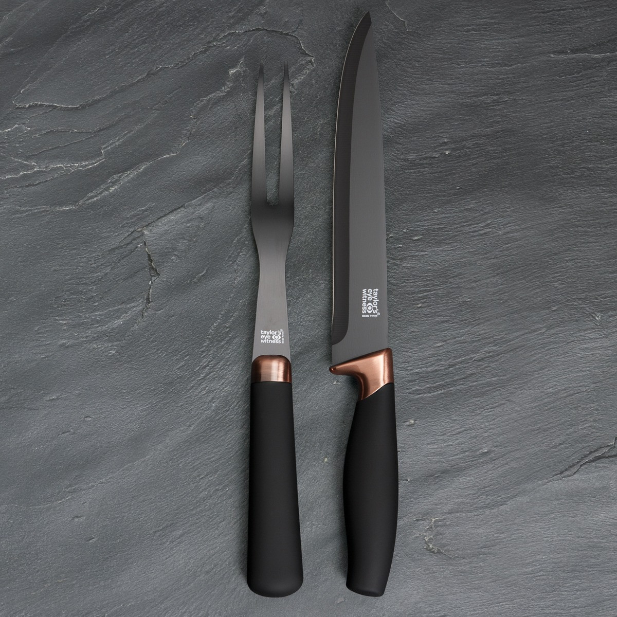 The Brooklyn Copper 2 Piece Carving Knife Set includes a Carving Knife and Carving Fork. The ergonomic handles have a soft-grip finish offering extra control and comfort. The knife features a super-sharp hollow ground blade with an antibacterial hard ceramic coating.