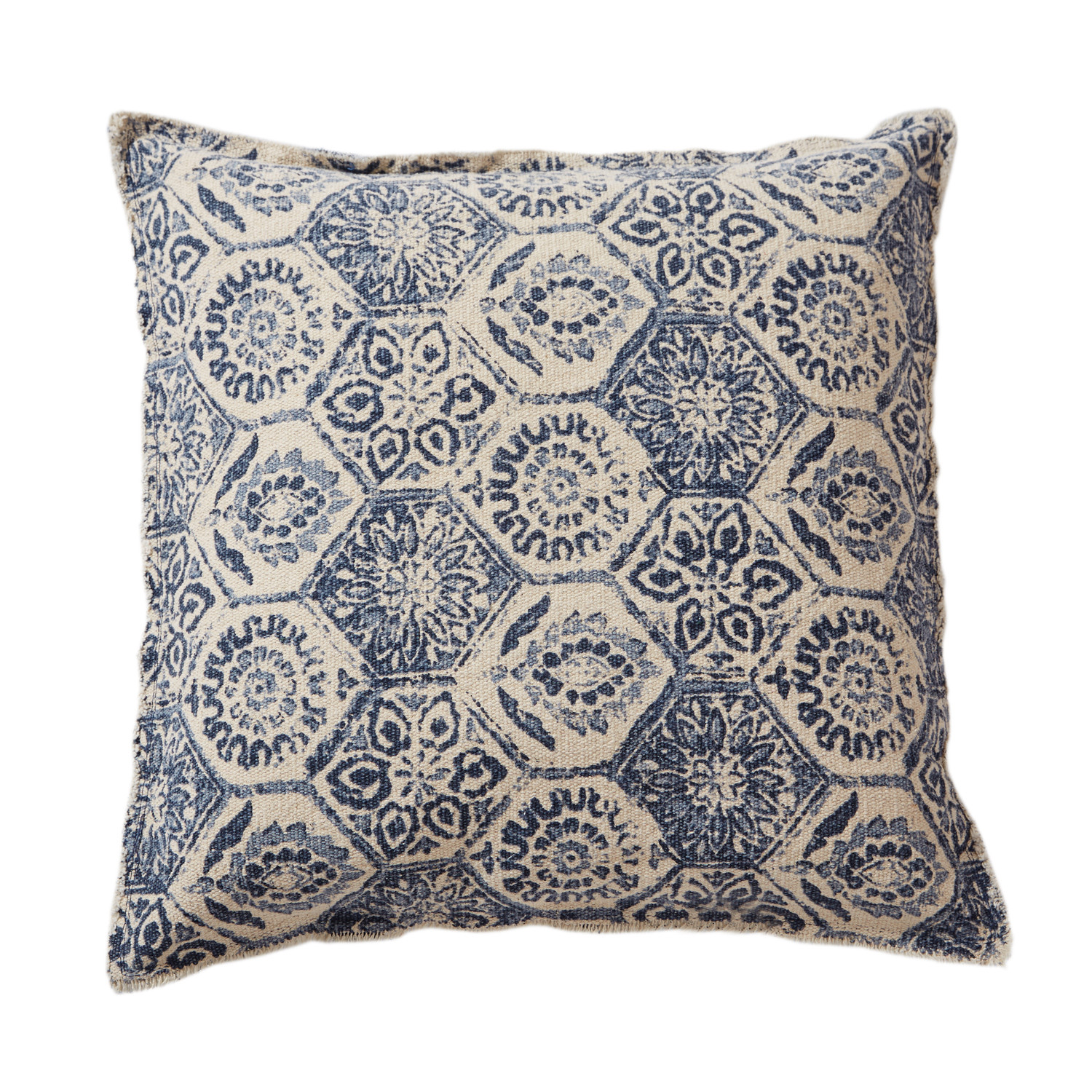 Our Calico Blue Cushion has a charming distressed pattern in blue and beige.