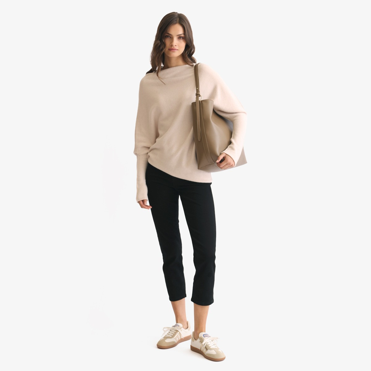 Modern bucket bag with spacious main compartment, interior pocket, magnetic closure, and sleek shoulder strap. Perfect for everyday wear. Includes protective dust bag.