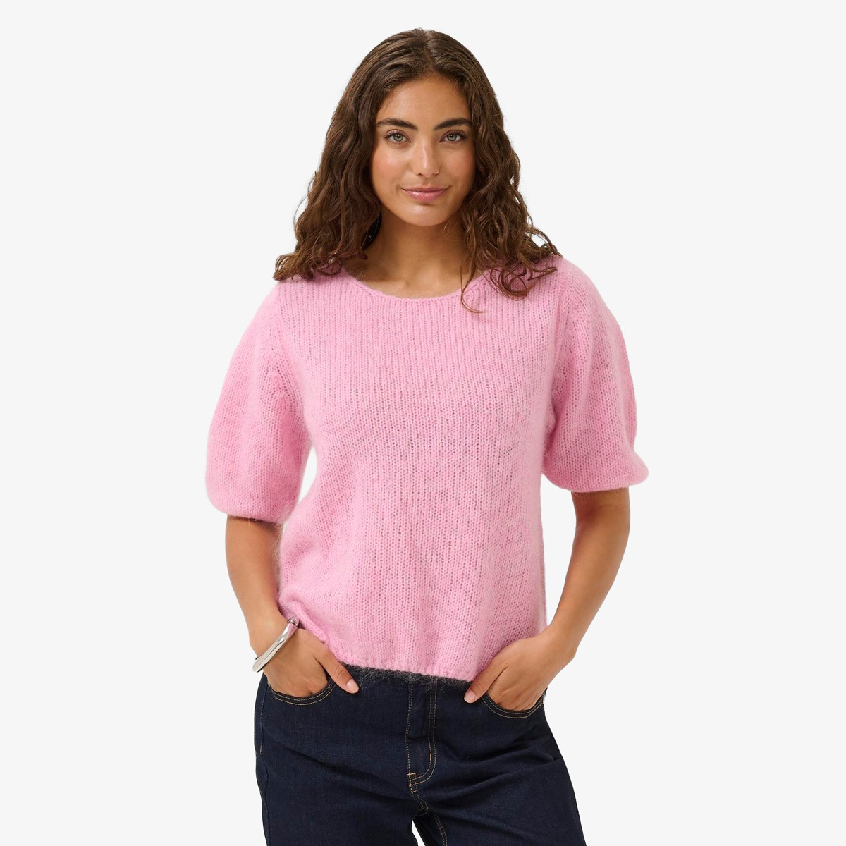 This fuzzy knit sweater has a soft, cosy feel thanks to its plush texture. Its simple silhouette and relaxed fit make it an effortless piece to style for both casual days and more polished looks.