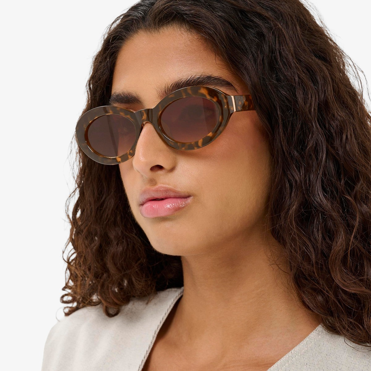 The Chrisna sunglasses feature bold oval frames in a rich tortoiseshell pattern, blending retro charm with modern sophistication. Their warm gradient lenses and sculpted silhouette make them a standout accessory for effortless, everyday style. These come complete with a stylish case.