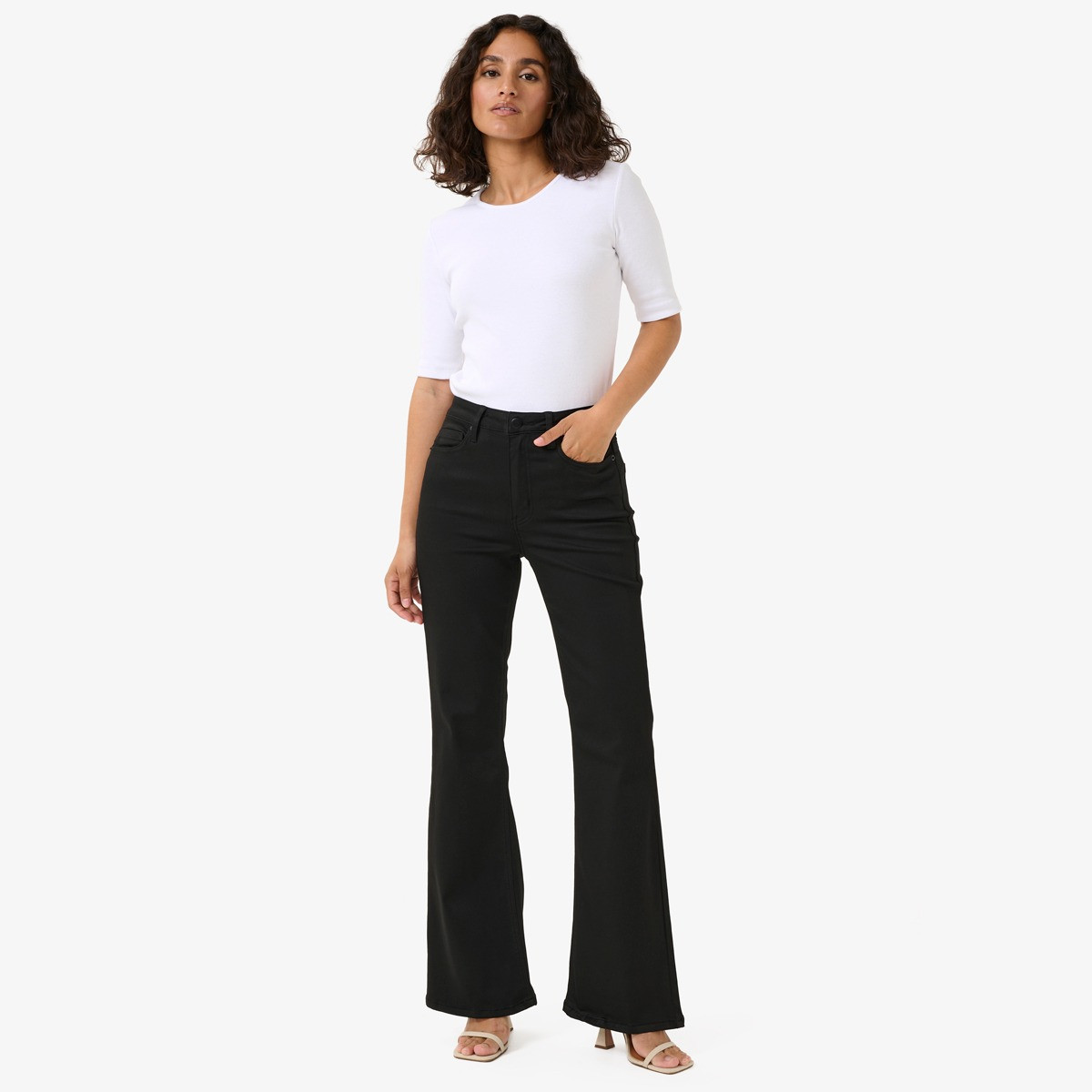 These jeans are high-waisted black denim with a sleek, fitted design through the hips and thighs, flaring out at the bottom for a classic bootcut style. They feature a button and zip closure and belt loops.