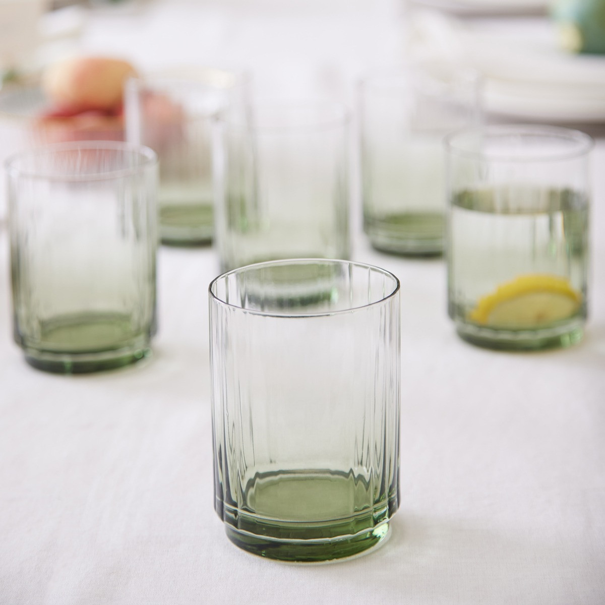 The Florence Glassware Collection features a delicate ribbed design in a smoky green hue. Elegant and refined, this is a perfect water glass for both everyday and special use.