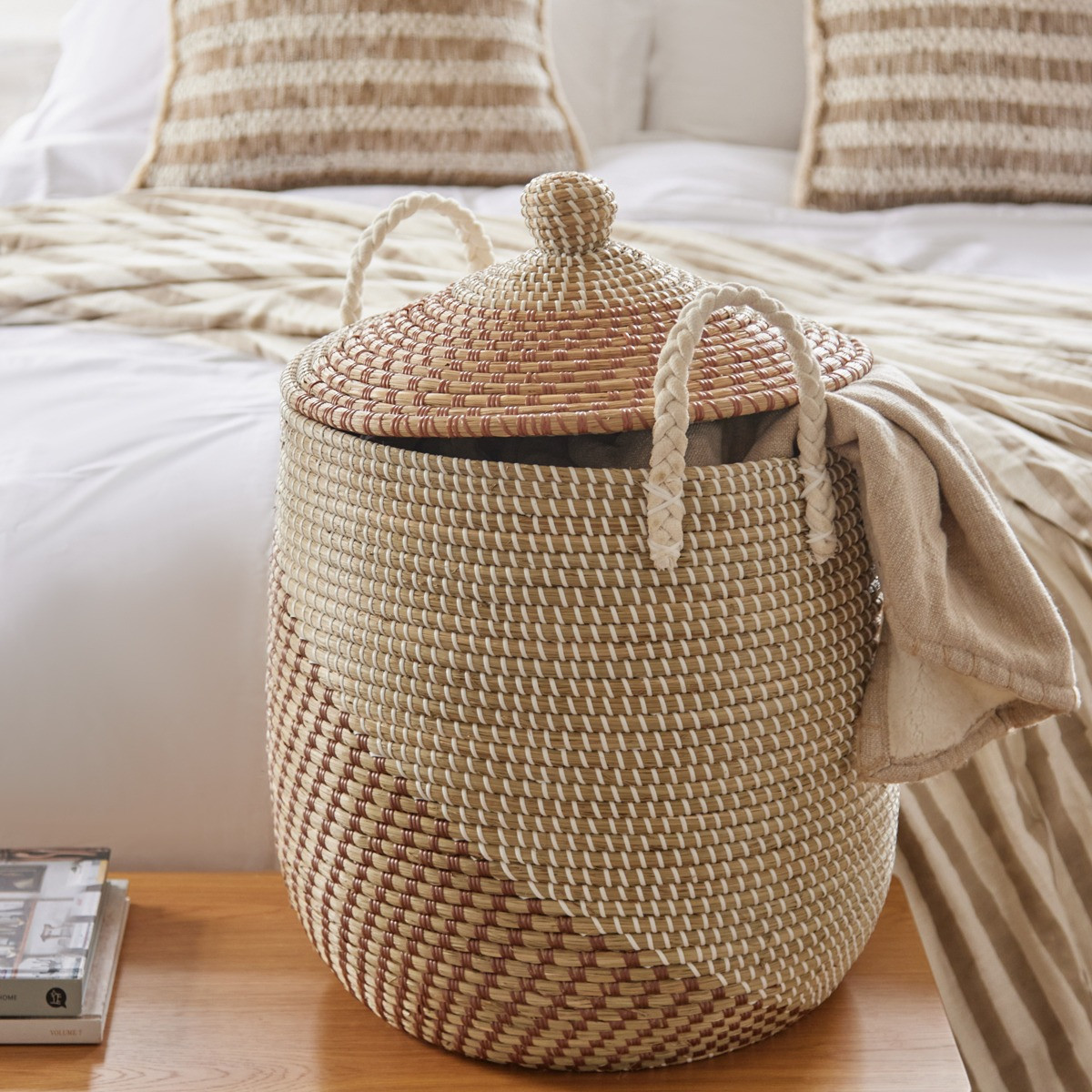Add natural texture to your home with the Gibson Laundry Basket. Woven with a striking two-tone design, it features a fitted lid and sturdy handles for easy carrying.
