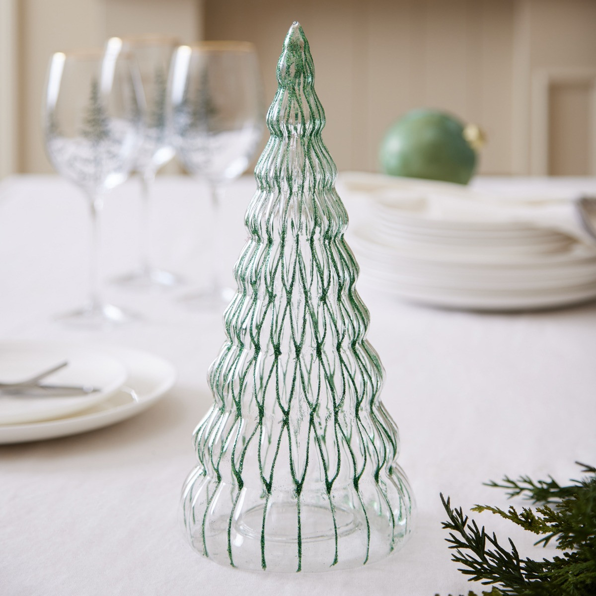 Create a warm seasonal glow with our Glass Tree Decoration featuring green detailing. Made from clear glass with delicate green spirals, this piece can be styled with an LED tealight or a string of micro lights for a beautiful illuminated effect. A perfect way to add light to your festive décor.