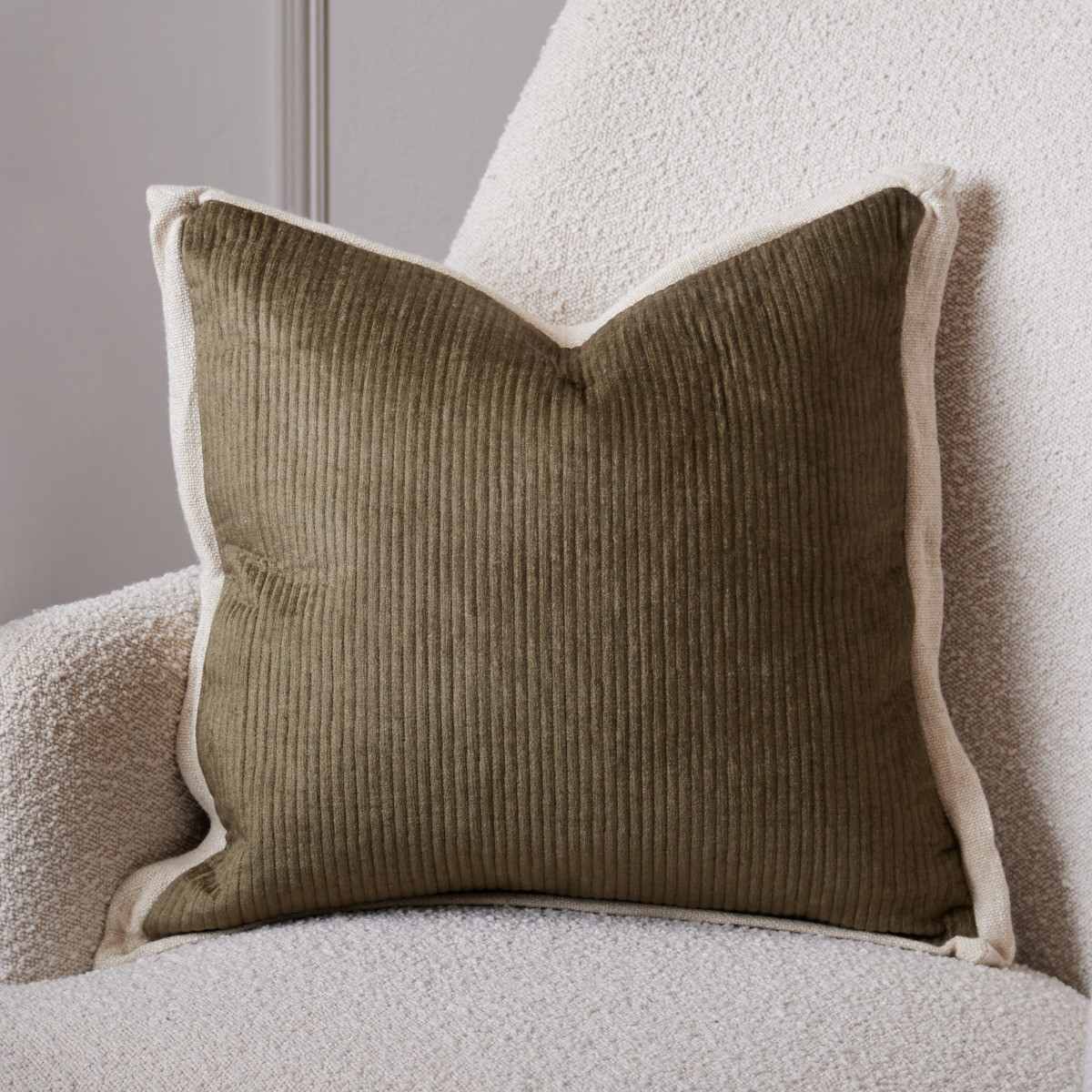 Our Green Ribbed Chenille Cushion brings a soft, tactile element to your space with its plush ribbed texture and muted green tone. Framed with a linen trim, it offers a clean, tailored look that works beautifully across sofas, beds, or armchairs.