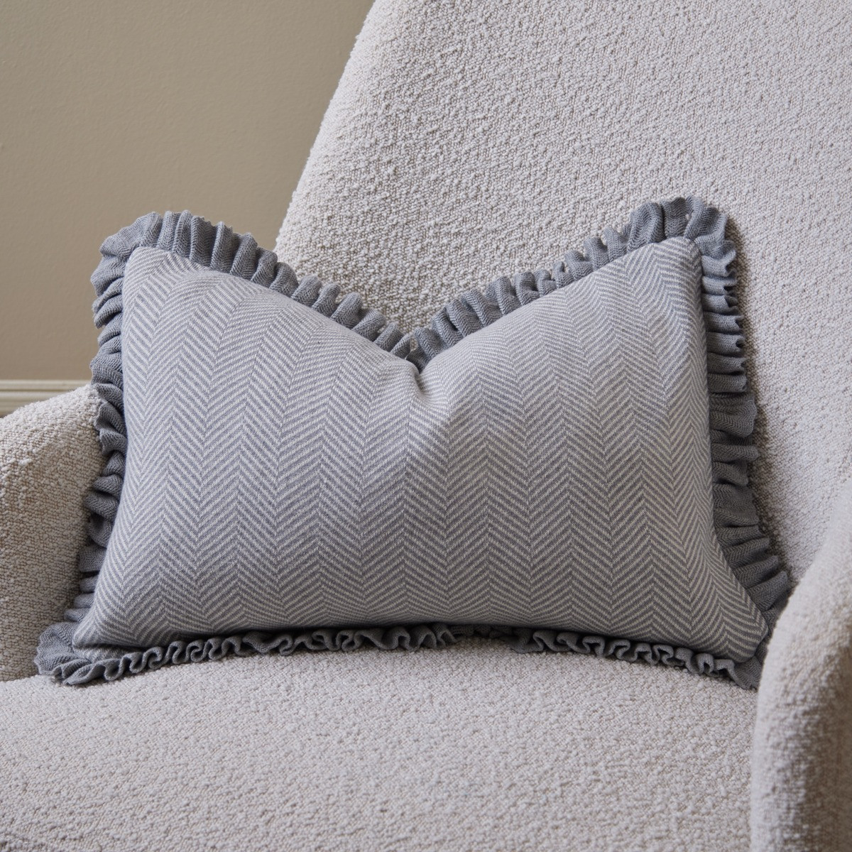 Our Herringbone Cushion has a grey herringbone pattern with a frill edge for added charm. Its gentle texture and warm tone make it a versatile piece for any room.