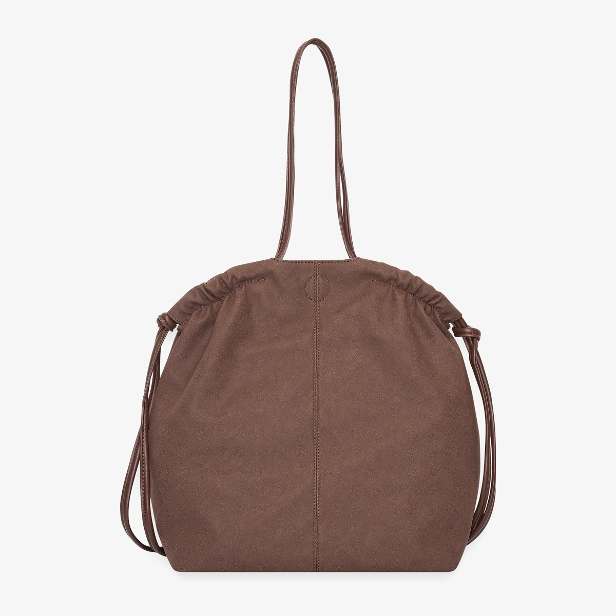 Soft brown drawstring bag with a relaxed silhouette. Features dual thin shoulder straps and gathered top closure for easy access. Made from textured textile material with a minimalist finish.