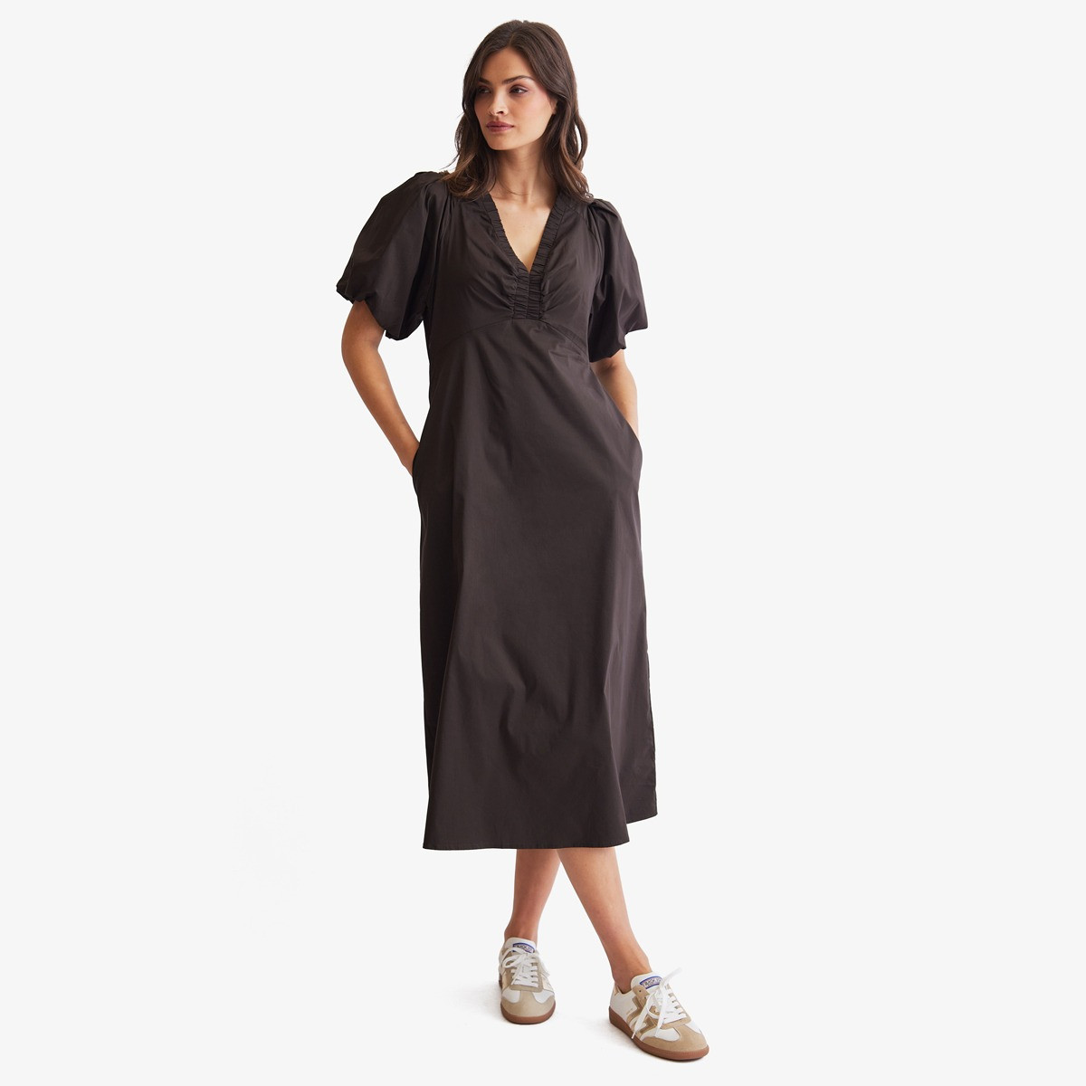 Our Ilana midi dress is made in cotton poplin. Features a flattering V-neckline with subtle gathering at the bust. It flows into a gently flared A-line skirt and has 2 discreet side pockets for added functionality.