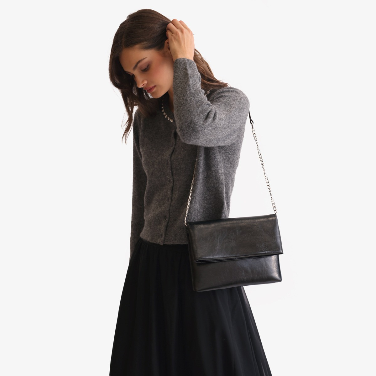 The Isla Clutch perfectly balances modern style with practical design. It features a sleek silhouette, an elegant chain-detail strap, and a smart, three-compartment interior. Finished with a secure magnetic closure. Includes protective dust bag.