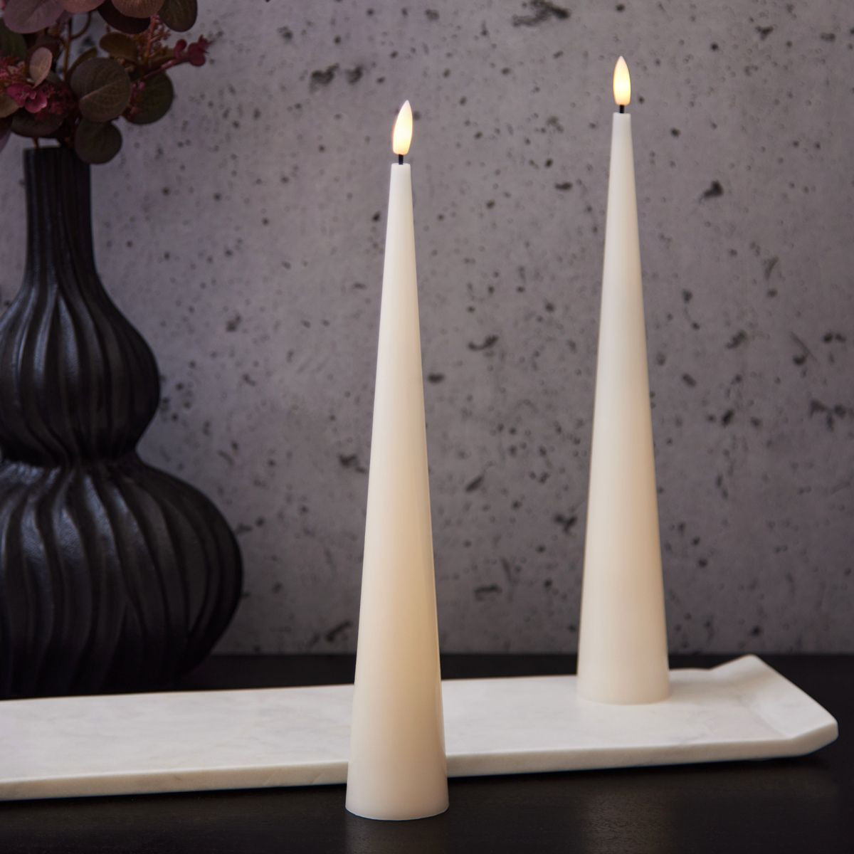Our LED Cone Candles are a beautiful and safe alternative to a real candle. Perfect for homes with pets and small children. The flameless glow mimics real candles with a gentle flicker. The safe and smoke-free way to add ambience to your interiors!        Each candle comes with a remote and a built in timer function.Â