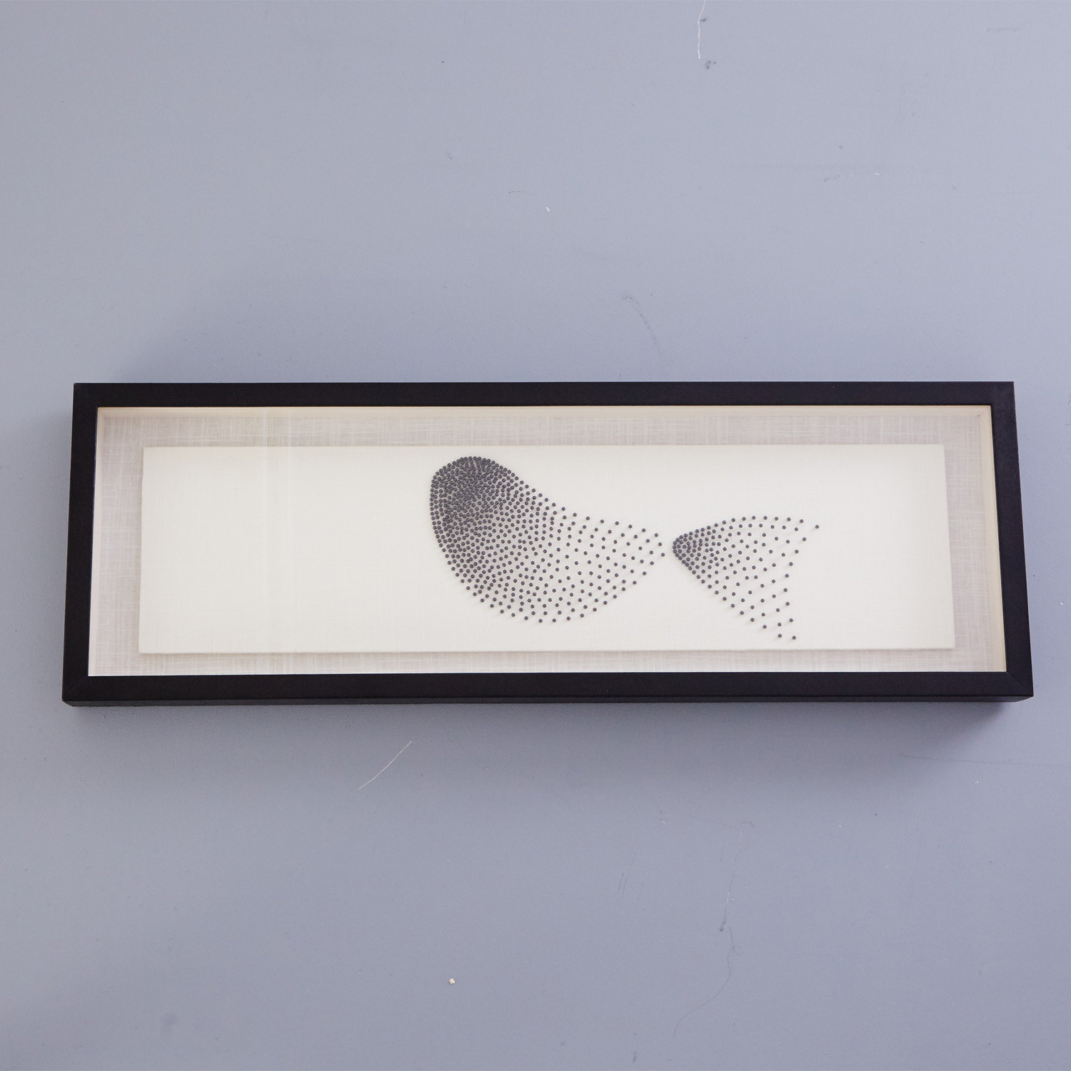 This 3D piece is framed in copntemporary black and ready to hang.