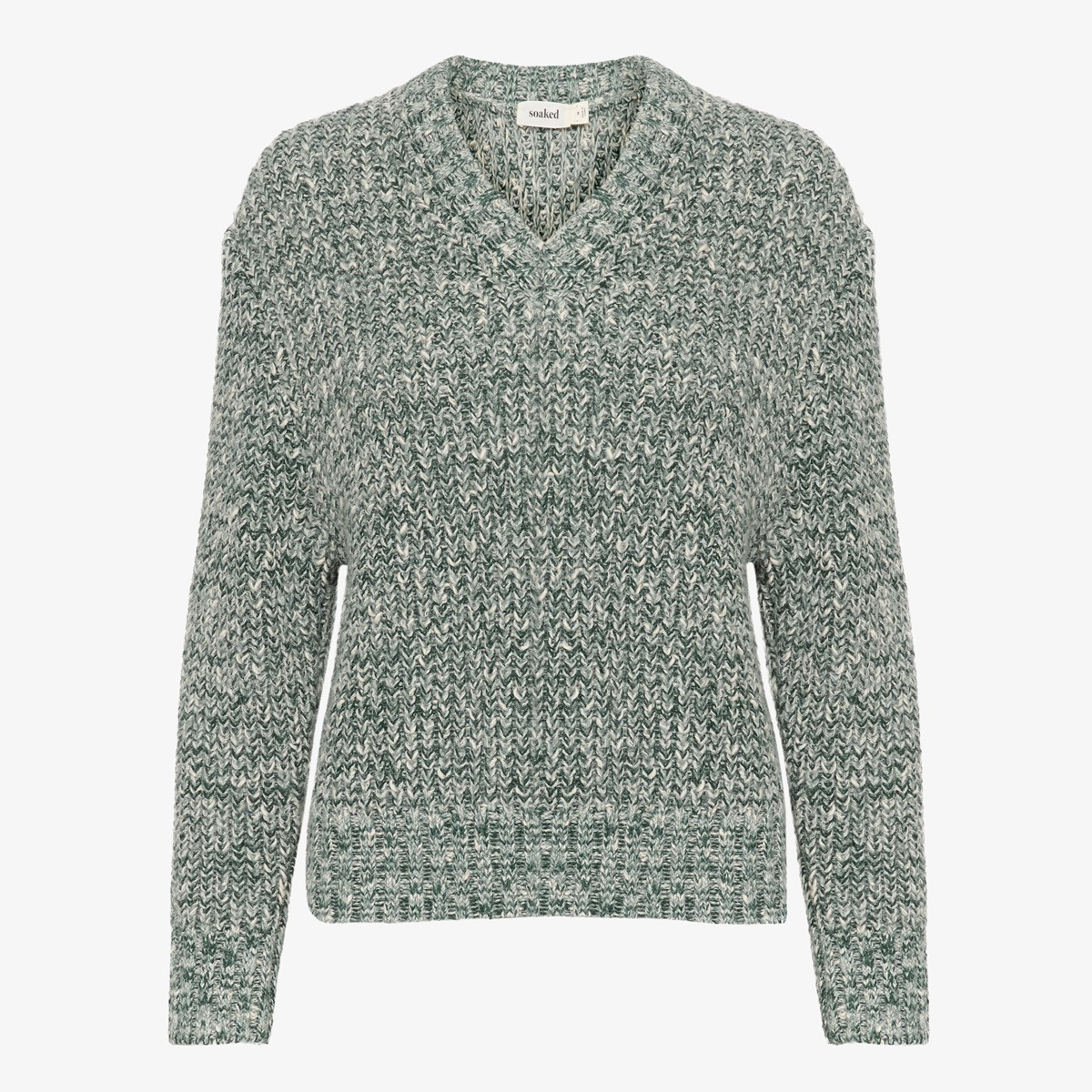 This is a textured V‑neck sweater crafted in a marled green‑and‑white knit. The yarn blend creates a soft, speckled look that feels both relaxed and refined.