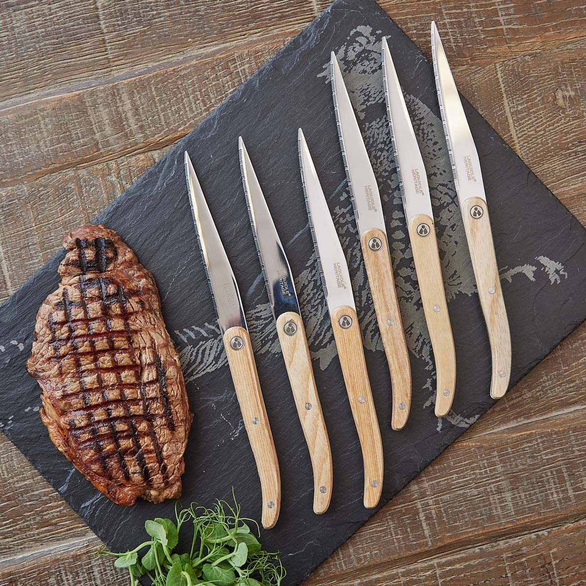 Handmade in France, these serrated steak knives by Laguiole combine a high-quality crafted blade with a beautifully designed wooden handle. Constructed from a stainless-steel material, the blade is 11cm and runs down the length of the handle making the knife more durable.