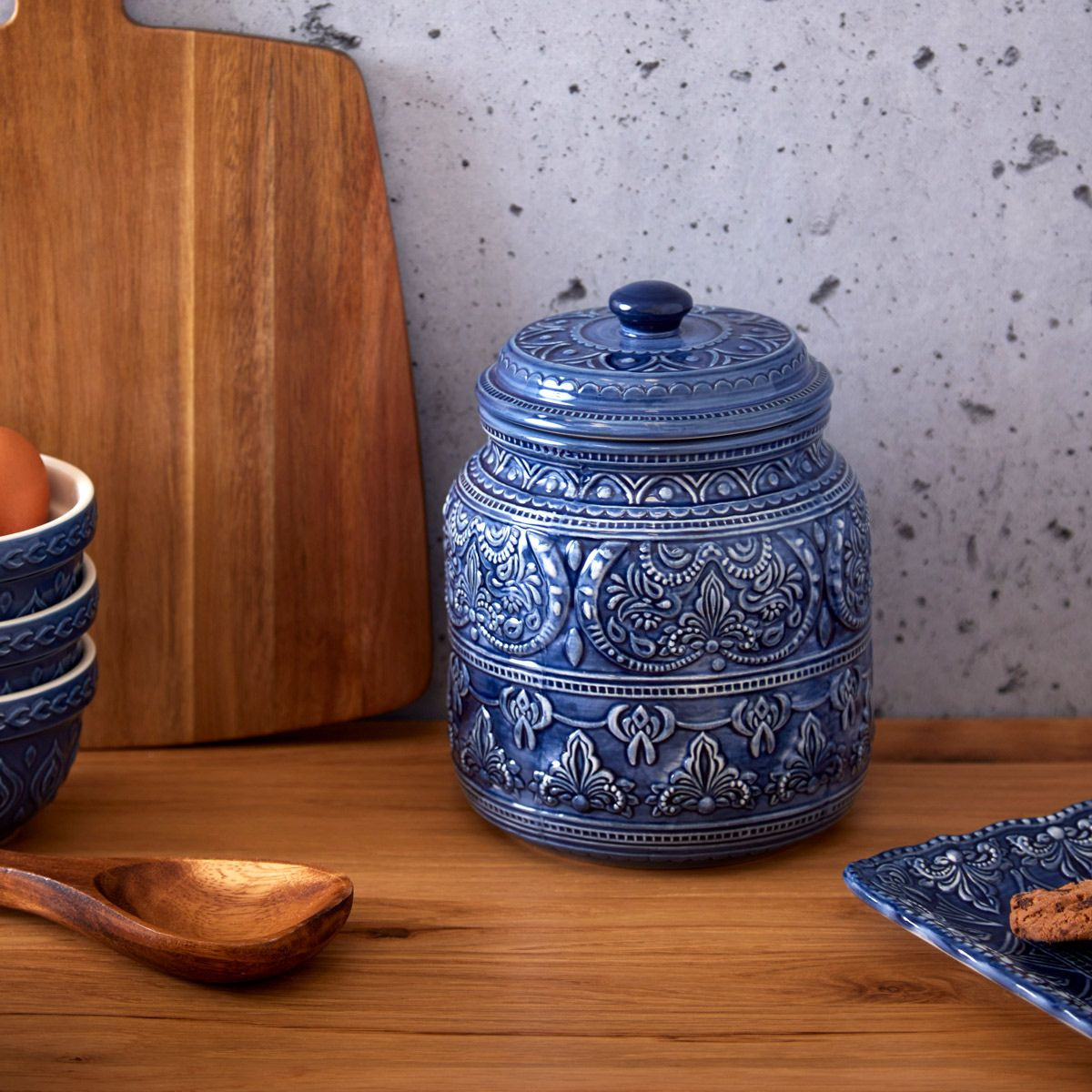 Store sweet treats or organise your pantry to perfection with our Large Embossed Jar. Finished in a rich blue glaze to add a pop of colour to your kitchen décor.