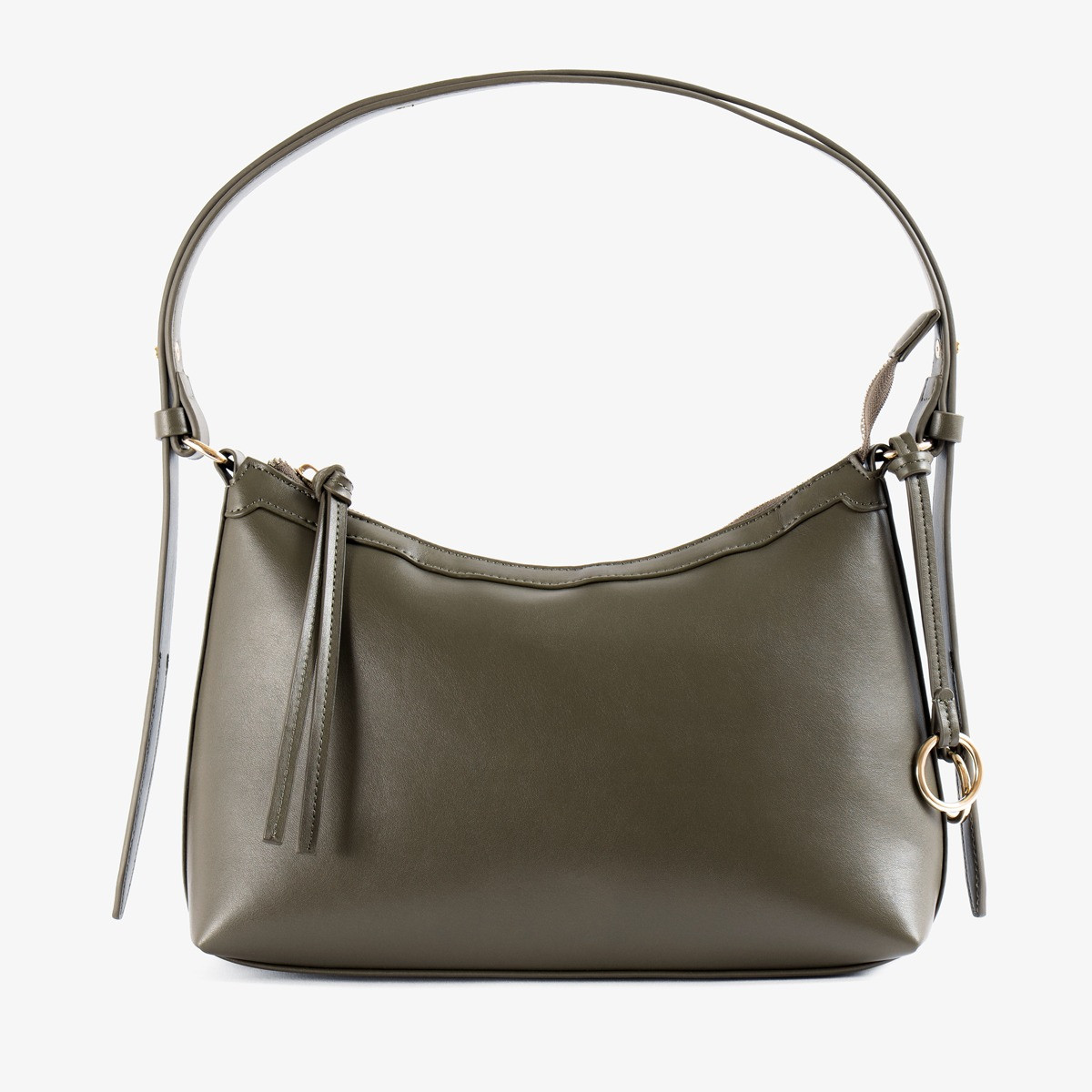 The Lauren Shoulder Bag in Olive features a structured silhouette with smooth textured finish, gold-tone hardware, and a single shoulder strap. Designed with a zip closure and internal pockets. Comes in a protective dust bag for added care.