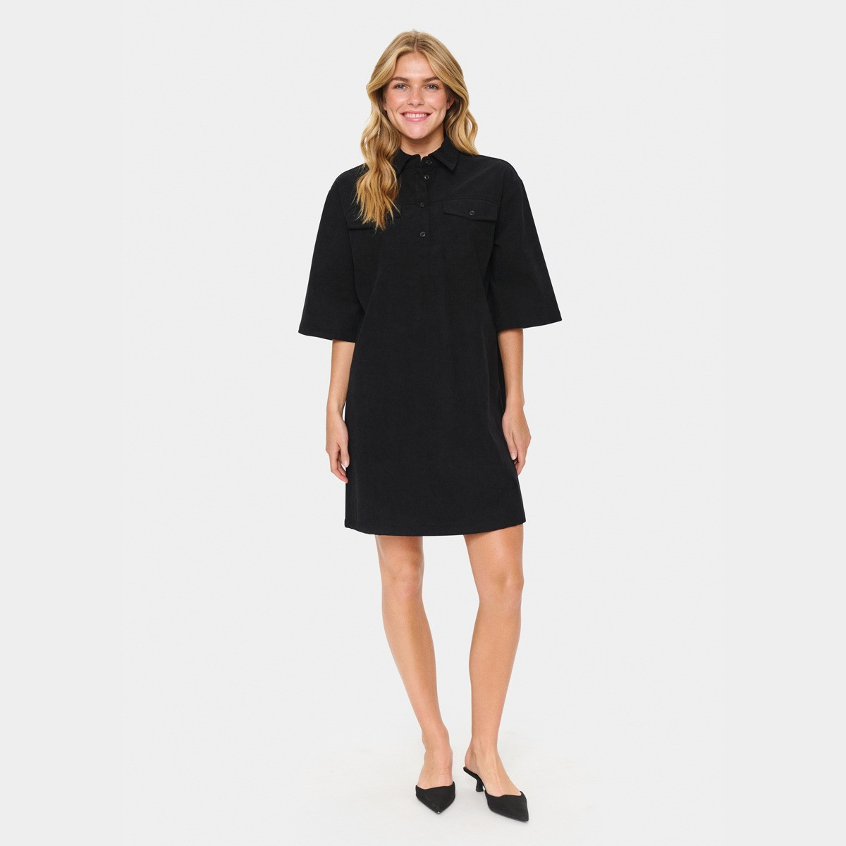 The Magnille Dress is a structured corduroy shirt dress with short wide sleeves, a classic collar, flap chest pockets, and a partial button placket.