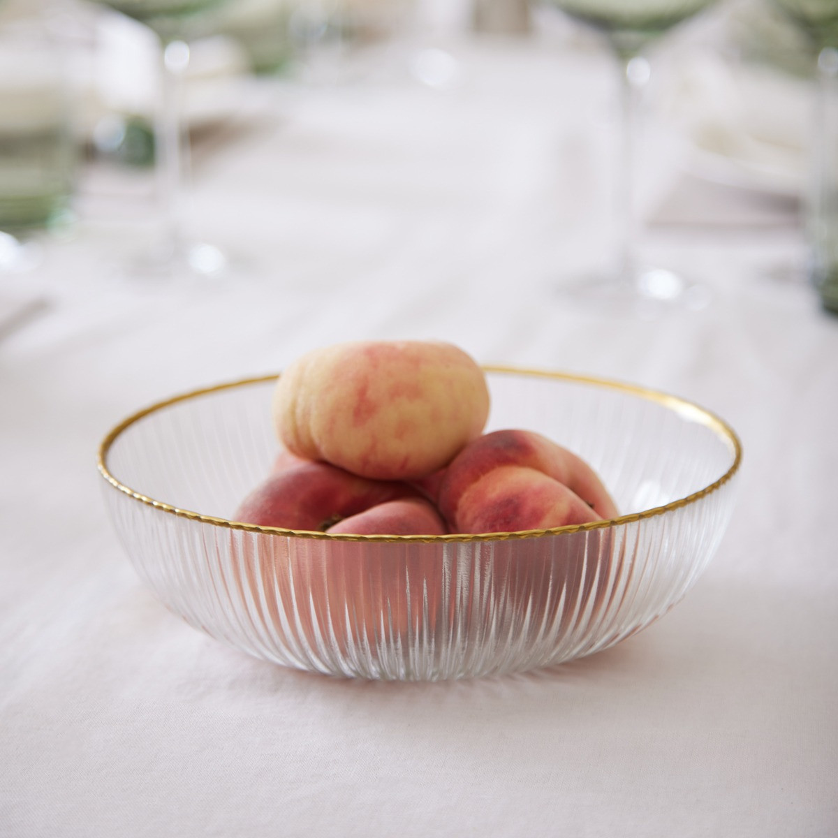 Add a statement piece to your table with our Majestic Ribbed Bowl. Made from clear glass with a ribbed texture and finished with a gold rim, this bowl combines style and function, making it perfect for serving desserts, fruits, or as a decorative centerpiece for any occasion.