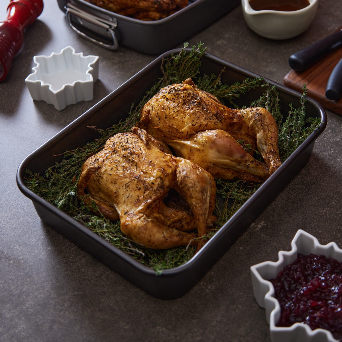 Enjoy years of fuss-free roasts with this medium roasting pan. It's size makes it ideal for roasting small joins of meet or perfect roast potatoes. Featuring a double Quantum II non-stick coating which is silicone based and therefore PFOA and PTFE free.