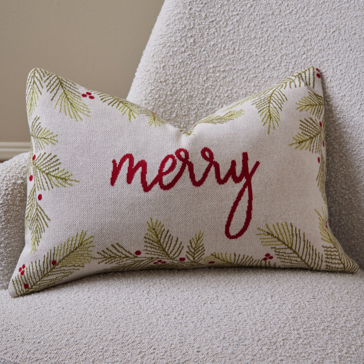 Bring a burst of festive cheer to your home with our Merry Cushion. Knitted in bold red script and framed by sprigs of pine and berries, it’s a fun and lively accent for the holiday season.