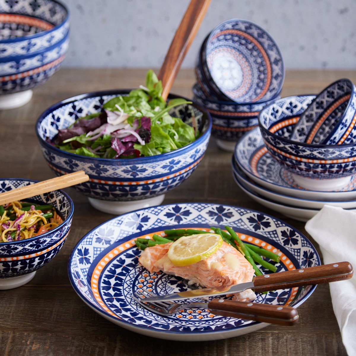 Our Tola Mirano Collection is as versatile as it is beautiful. An eye-catching geo pattern in classic colours of blue and orange adds a pop of colour to your table.
