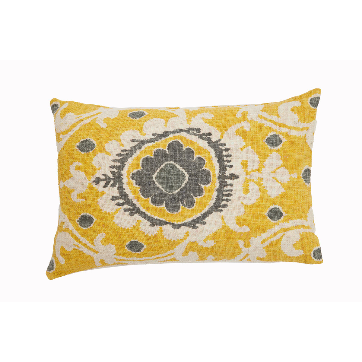 This decorative cushion offers an eye-catching pattern made up of grey and white tones set on a colourful yellow background. It is perfect for adding an interesting accent colour to your living space.