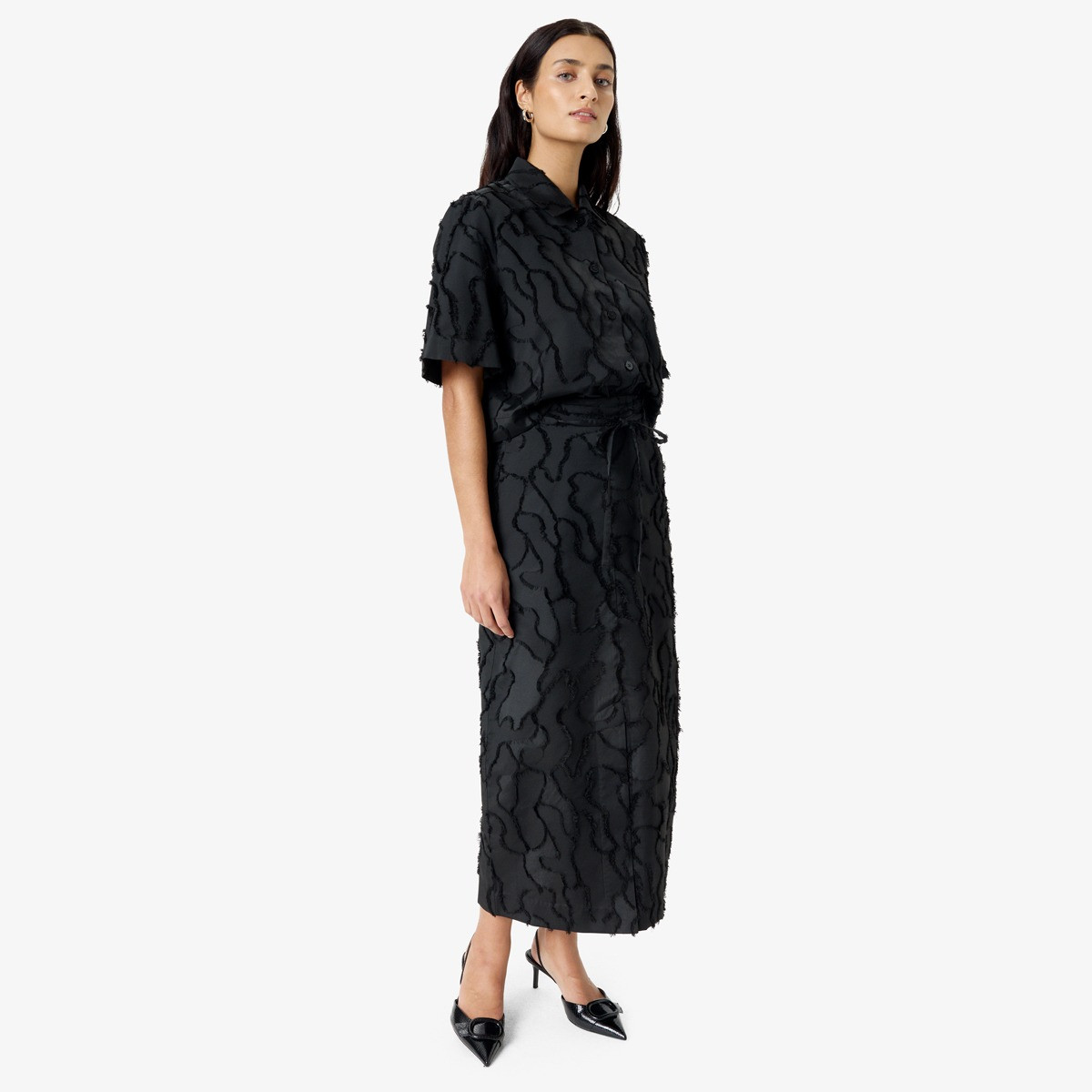 Black midi skirt with an asymmetrical wrap silhouette and front slit detail. Features an abstract textured pattern and a self-tie fabric belt at the waist. Crafted for a flattering fit with a modern edge, ideal for both day and evening styling.