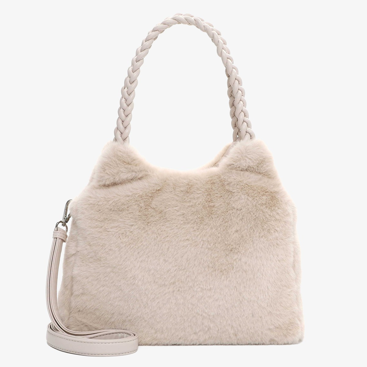 Plush beige handbag with a braided handle, zip closure, spacious interior, phone pocket, and removable cross-body strap.