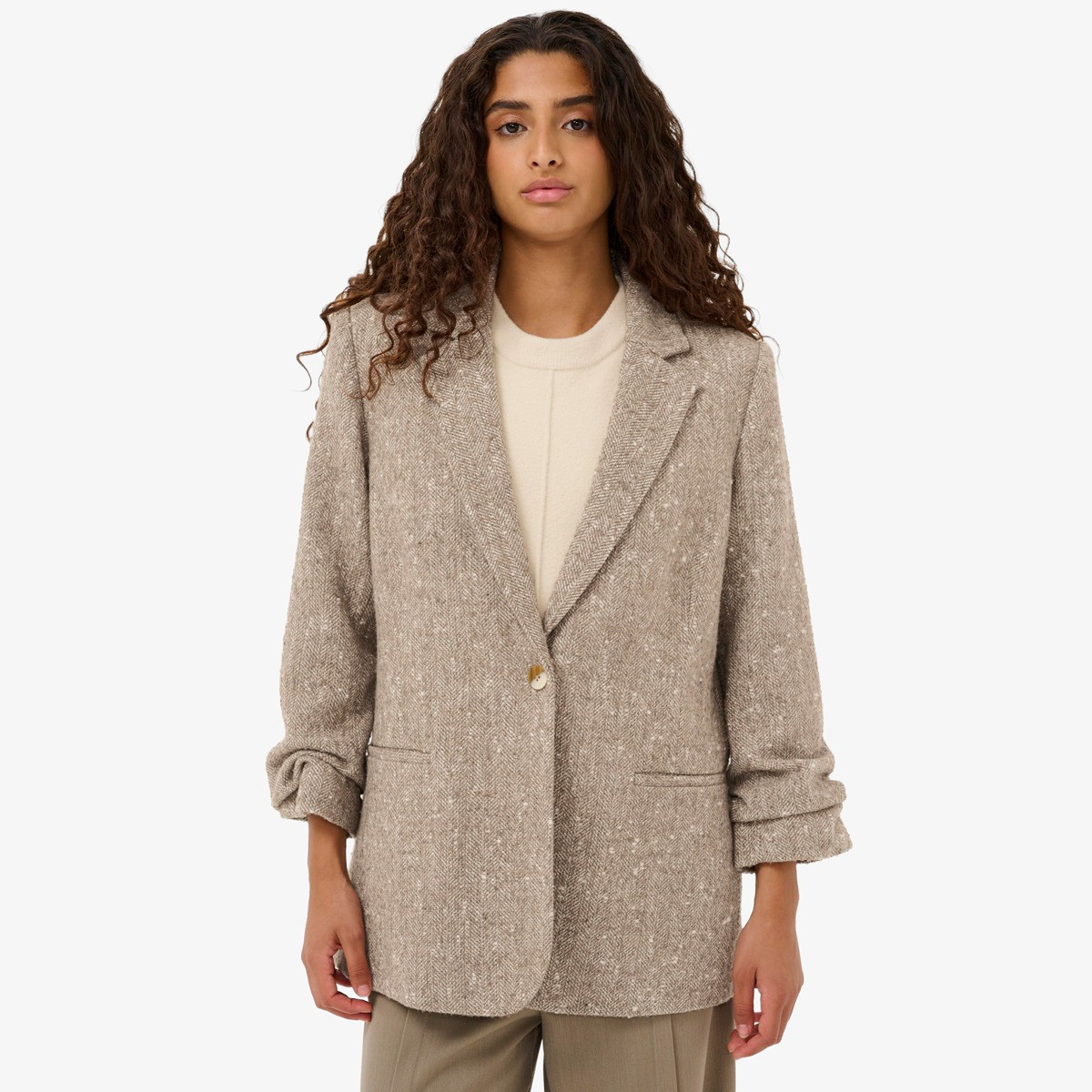 This softly structured tweed blazer is crafted in a warm beige herringbone weave with subtle flecking, giving it a timeless, textured finish. Its relaxed tailored fit, notched lapels, and single-button closure make it an effortlessly jacket.