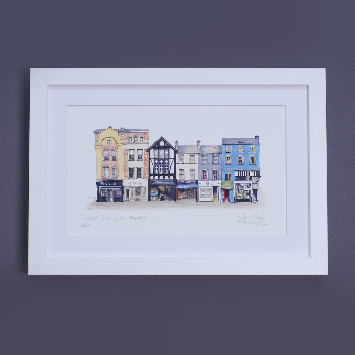 The Oliver Plunkett Street Framed Art print is a limited edition of an original drawing by Jill Cotter of Corkidoodledo. Bring the hustle and bustle of Oliver Plunkett Street, Cork City into your home. Drawn from the infamous Winthrop Arcade this beautiful piece of artwork is sure to brighten up your home.Â
