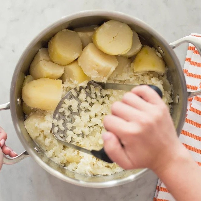 Designed for efficiency, this OXO Potato Masher effortlessly produces velvety, lump-free mashed potatoes. Its wide, cushioned horizontal handle enables direct downward pressure absorption, while a fine-grid stainless steel mashing plate ensures consistently smooth results.
