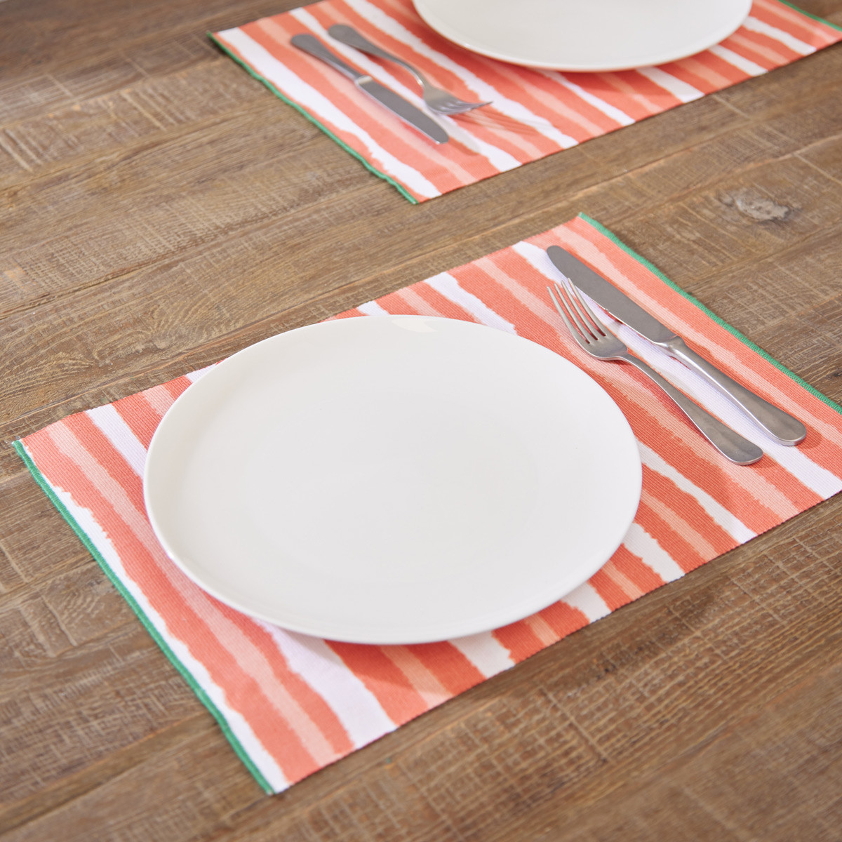 Brighten up your dining experience with our Peach Stripe Placemats. Featuring a vibrant peach & white stripe with a contrast stitched edge, this placemat adds a pop of color to any table setting. Comes as a set of 6. Pair with our green stripe napkins for a perfect setting.