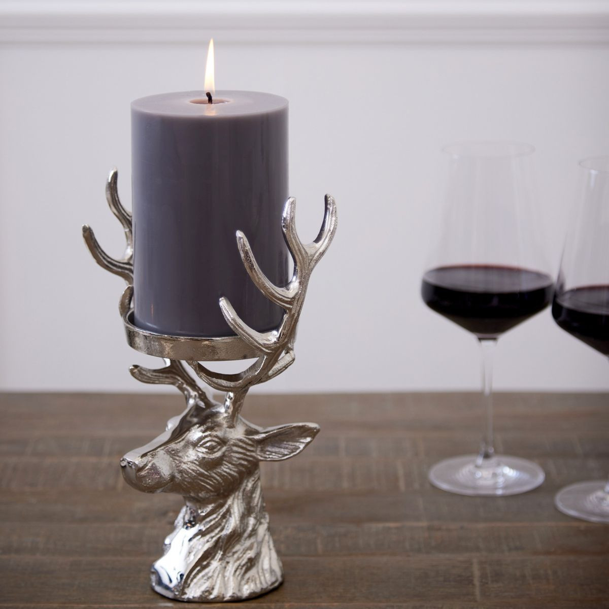 Our Picola Deer Pillar Candle Holder is in a textured silver finsih. The base for the pillar candle is nestled between the antlers making this a charming addition to your festive stylings. Add to your mantlepiece or use as a striking Christmas table centrepiece.