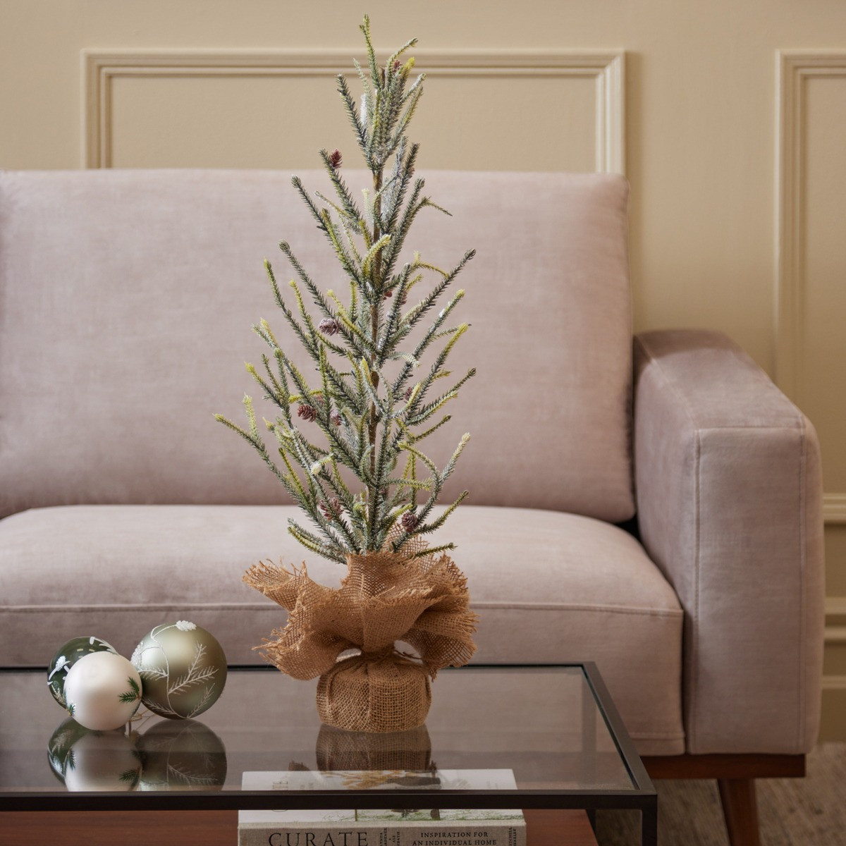 A festive mini Pine tree, set in a rustic jute sack base. Perfect for adding seasonal charm to tables, shelves, or cosy corners.