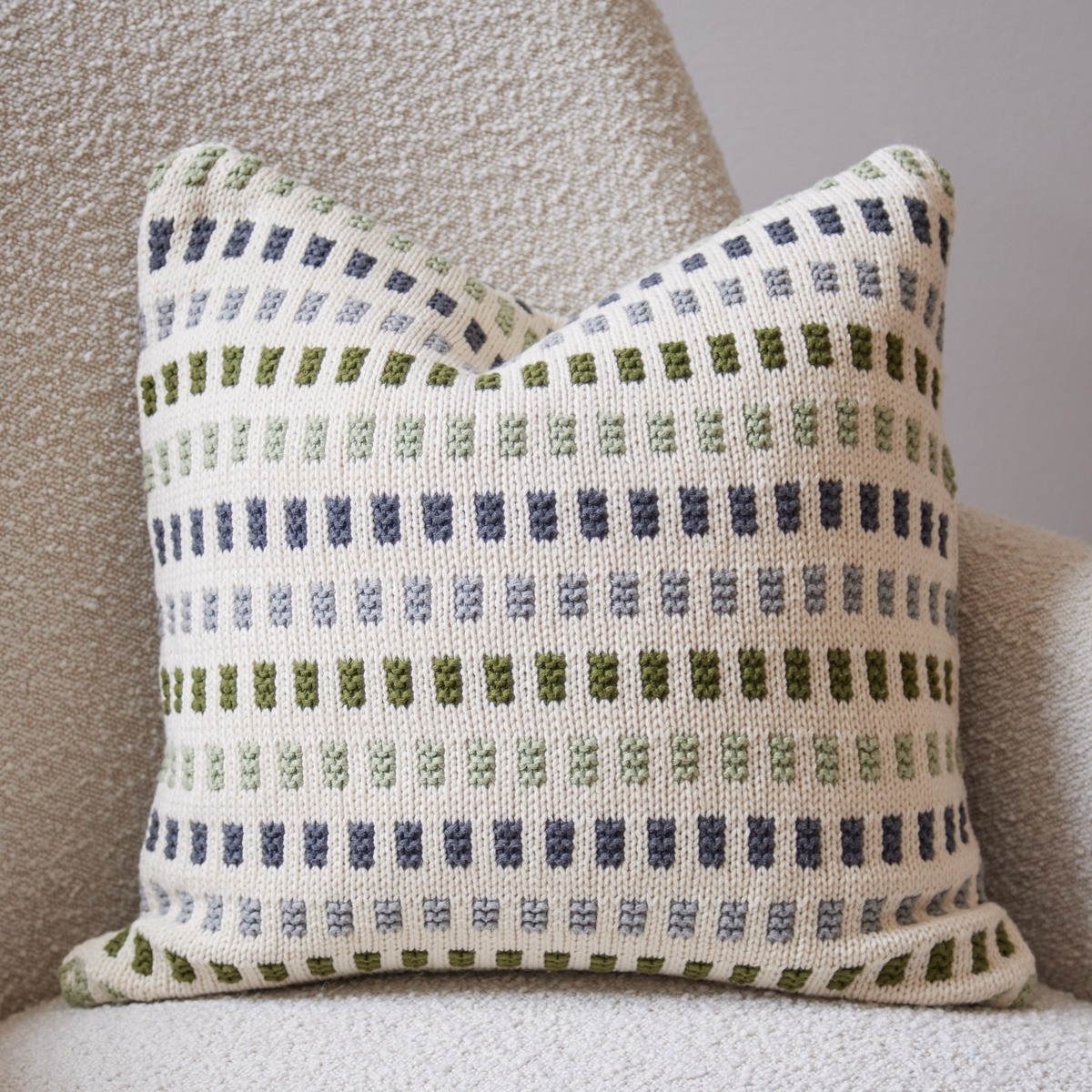 Add a playful touch to your space with our Pixel Stripe Green Cushion. Its modern pattern in soft greens and blues brings subtle colour and texture to sofas or armchairs. Perfect for mixing with plain cushions for a fresh, contemporary look.
