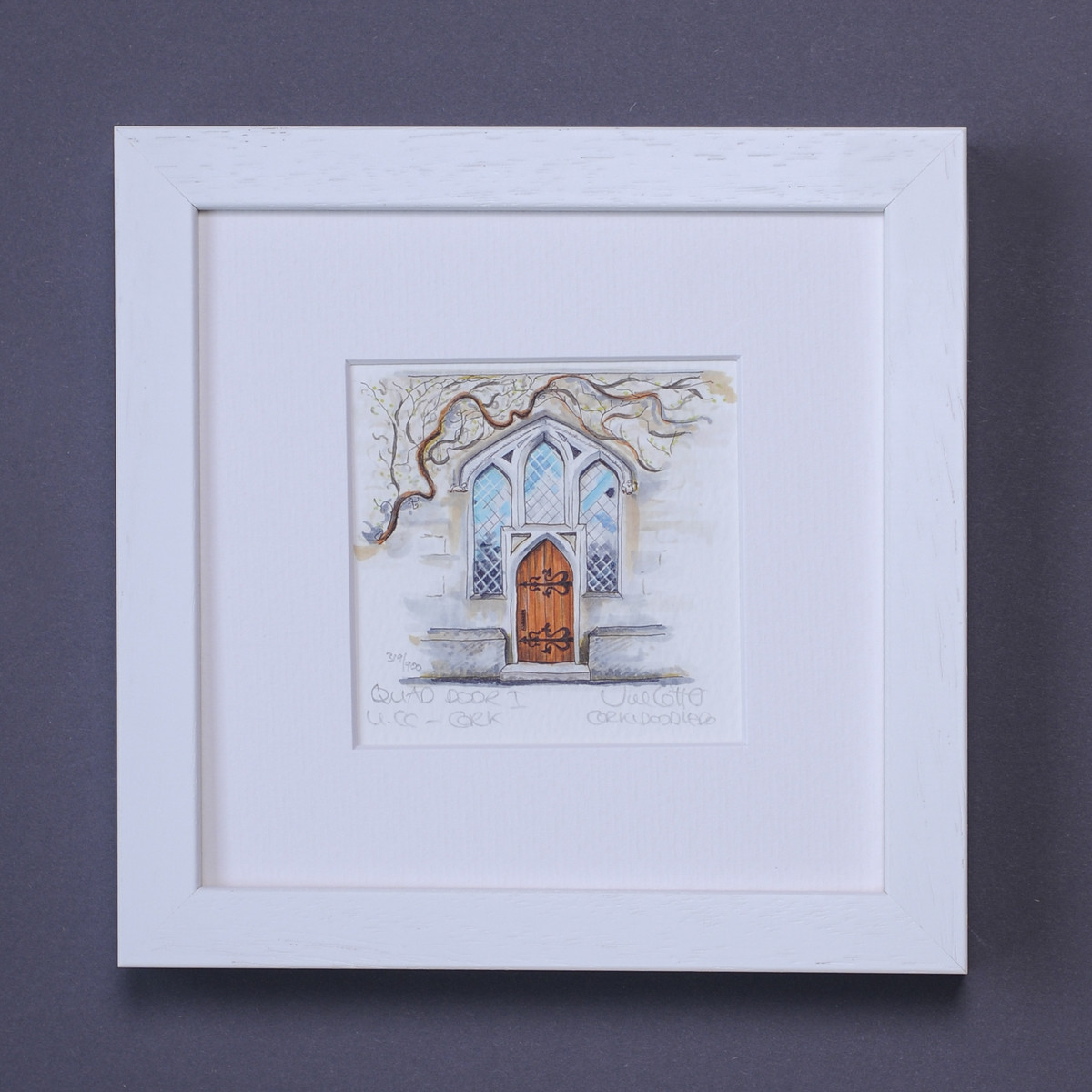 The Quad Door Framed Art print is a limited edition of an original drawing by Jill Cotter of Corkidoodledo. A summer doorway scene in the Quad, University College, Cork. The perfect gift for alumni.
