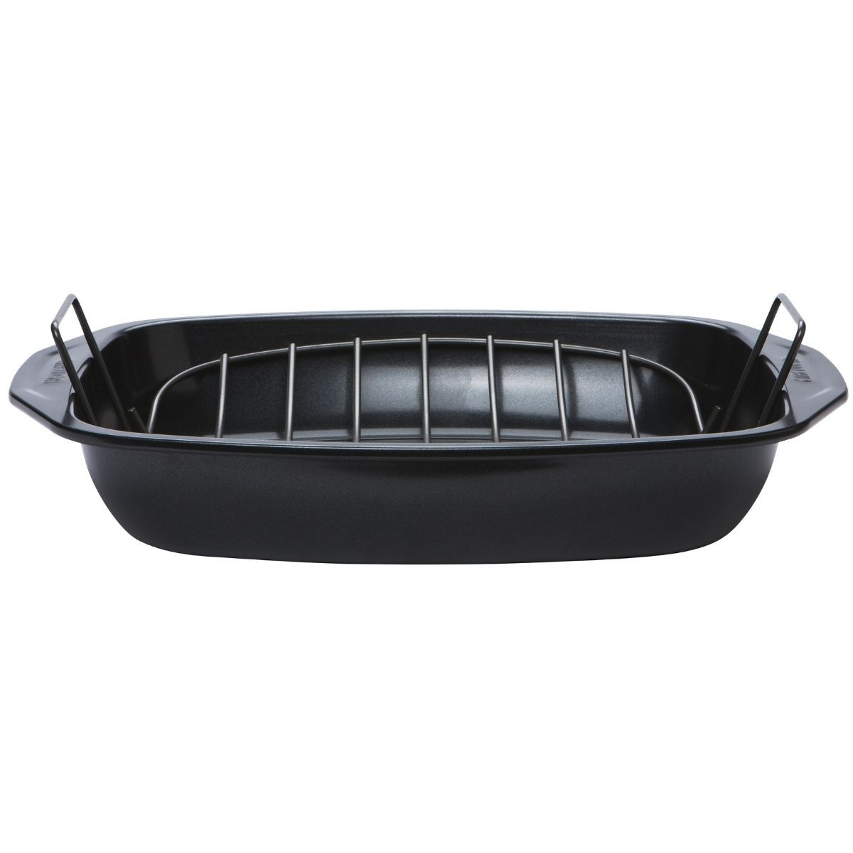 This Roaster & Rack is perfect for roasting your favourite meat and veggies. This roasting tin has a convenient u-shape rack for your meat to keep it off the bottom of the pan. The heavy-duty carbon steel construction promotes even heat distribution while the superior nonstick technology allows for easy cleanup.