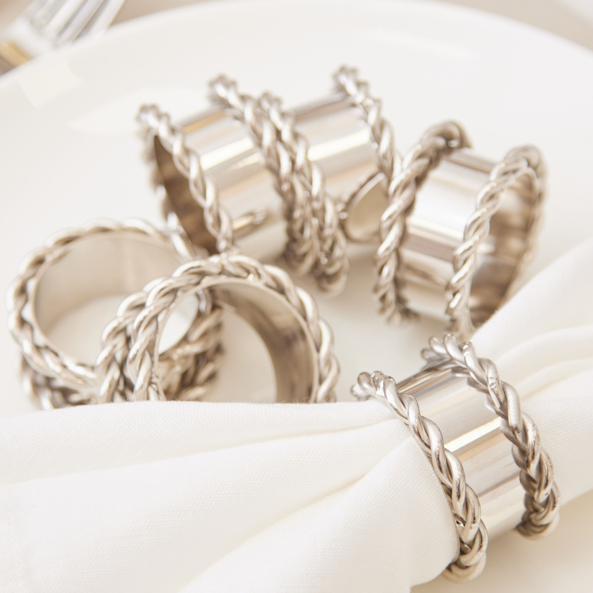 Add a decorative touch to your table linens with our Rope Silver Napkin Rings. The rope detail accompanied by the mirrored finish gives the napkin rings a traditional but sleek appearance.