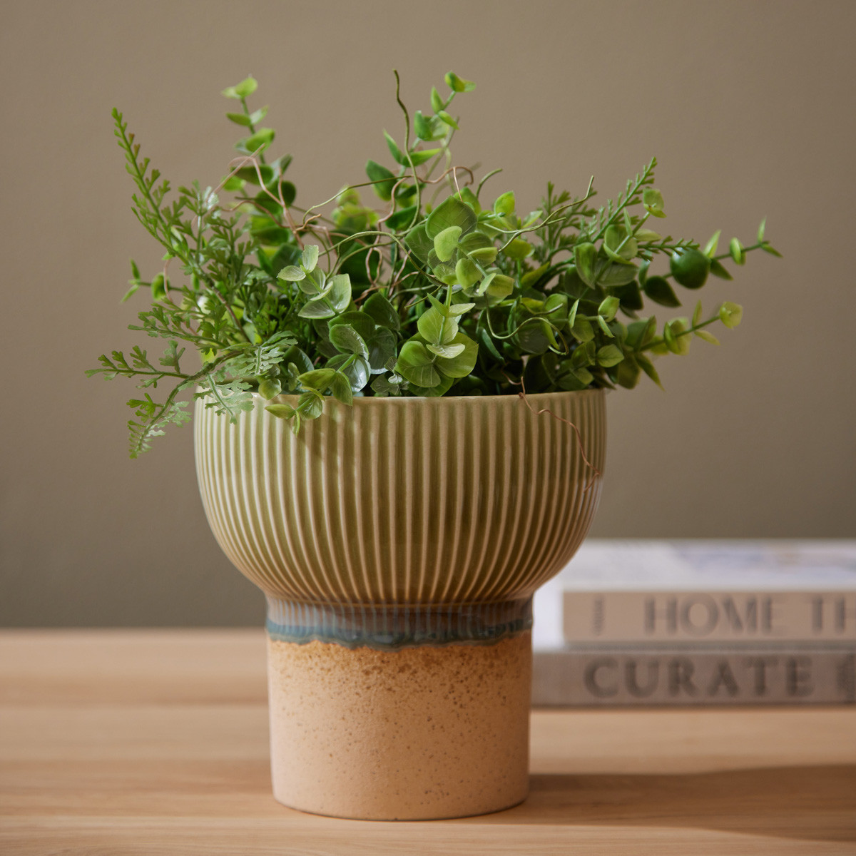 Our Sheelin Pot combines modern style with earthy elegance. The sand coloured base raises the lined green pot, combining both functionality and aesthetics.