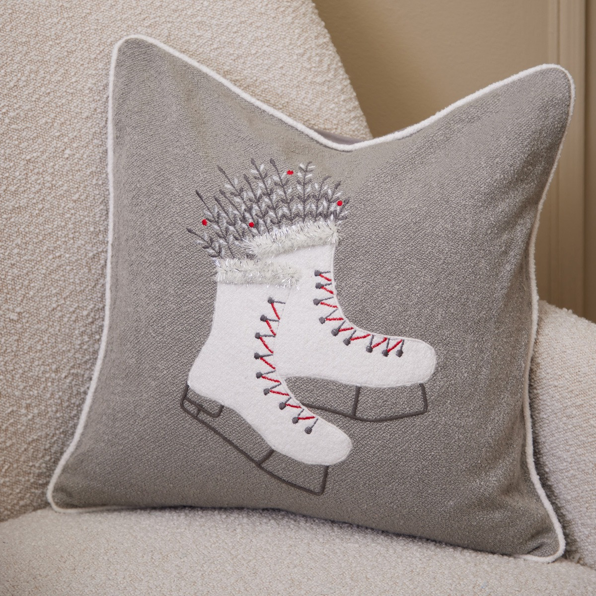 Our Skates Cushion adds a playful seasonal touch with embroidered white ice skates and red laces on soft grey fabric. A cheerful accent for winter décor and cozy corners.