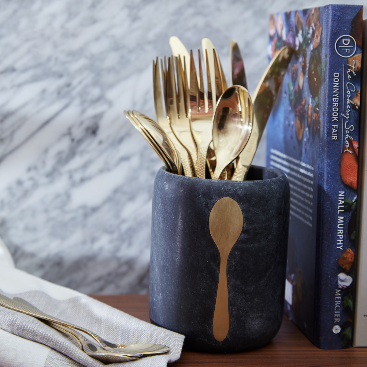 Our sturdy Spoon Grey Marble & Brass Cutlery Holder will look great on your countertop and hold all your daily utensils in one handy place. This is a weighty and long-lasting utensil holder, an artistic solution for kitchen organization.