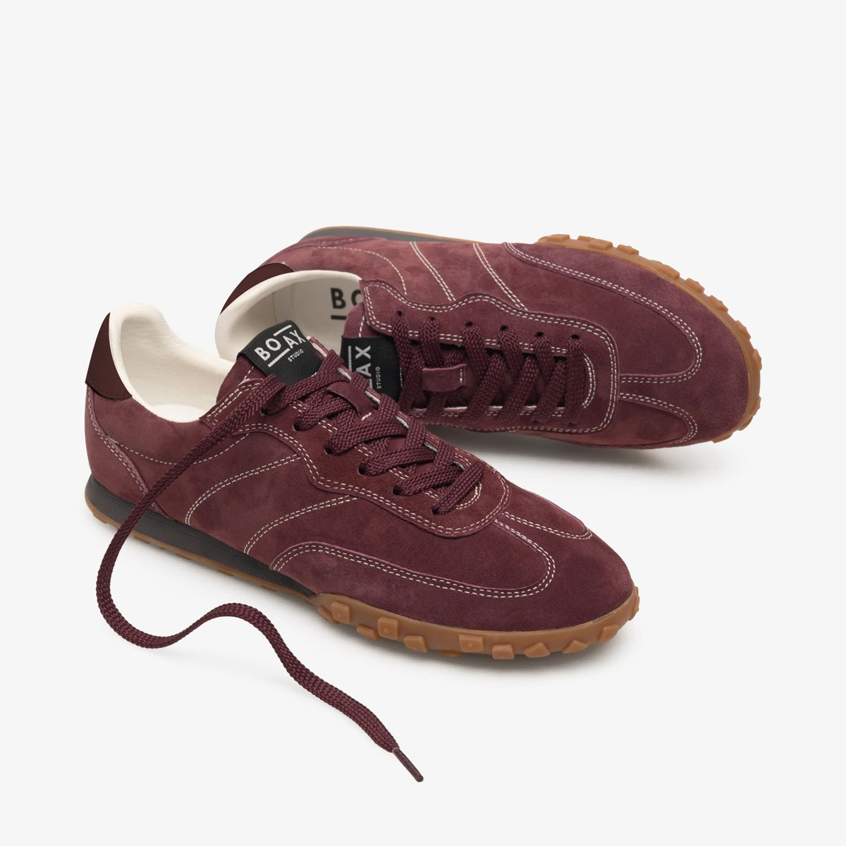 The strike trainer is crafted from premium suede and is the perfect blend of chic and casual. They feature white stitching, a brown rubber sole, and matching burgundy laces.