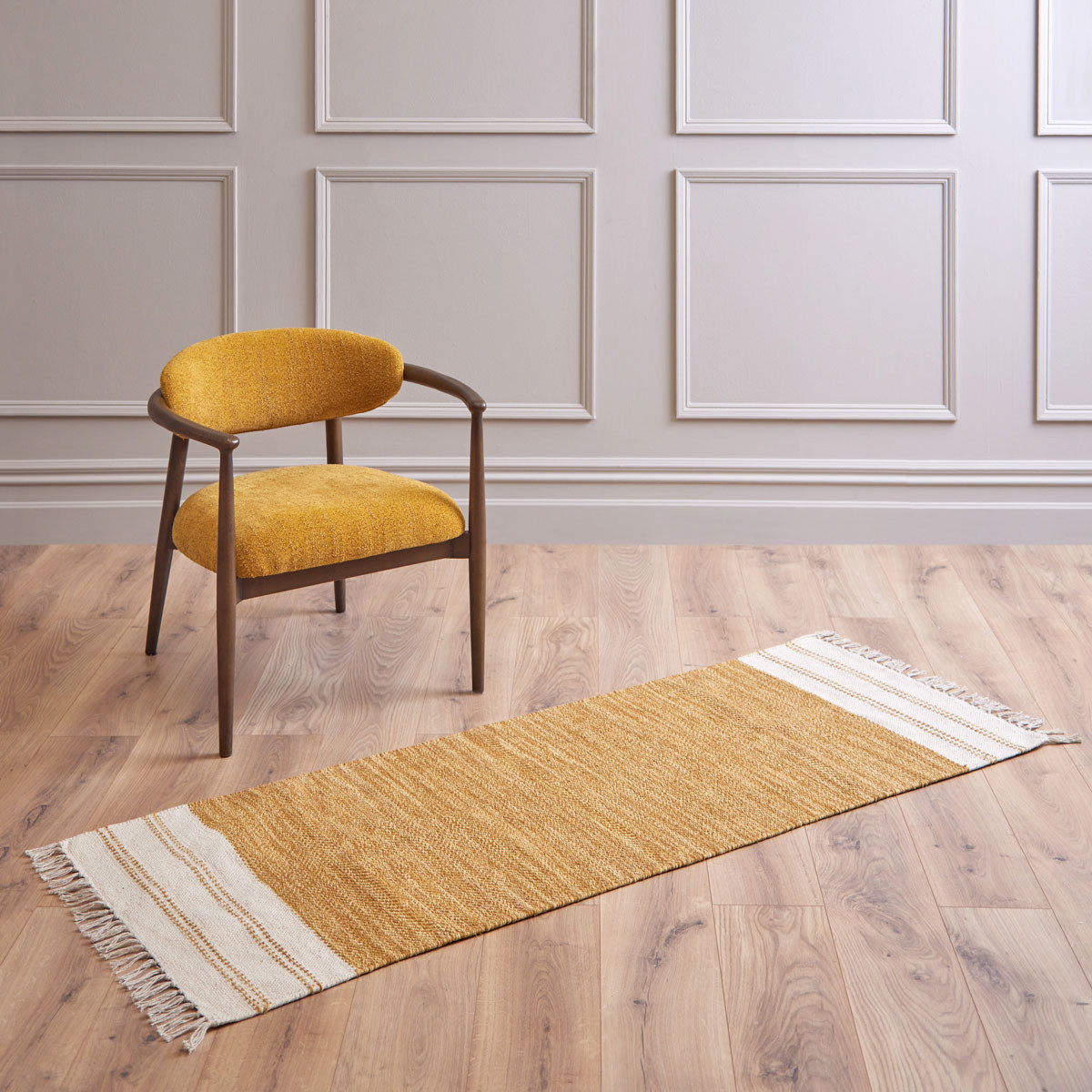 Our Sunisa stripe runner rug features a textured gold colored pattern with wide cream bands at both ends, finished with stitched designs and fringed edges. It's perfect for adding style and comfort to hallways or narrow spaces.