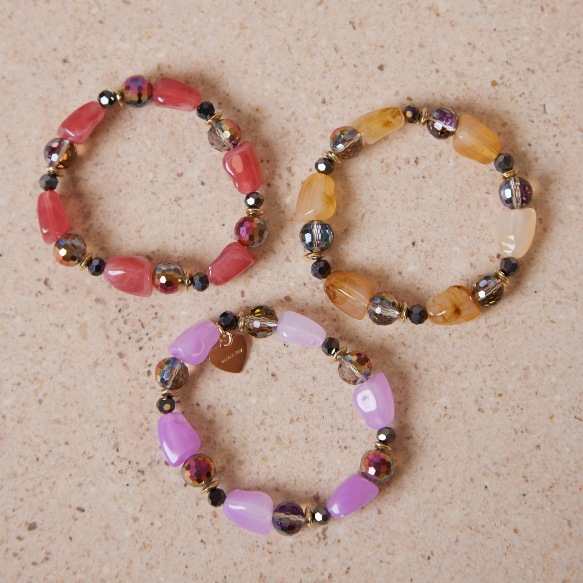 This beaded bracelet set includes three elastic designs, each finished with a mix of faceted beads and smooth stones in warm, complementary colour palettes. Designed to be worn together or mixed and matched, they add texture and gentle sparkle to everyday outfits.