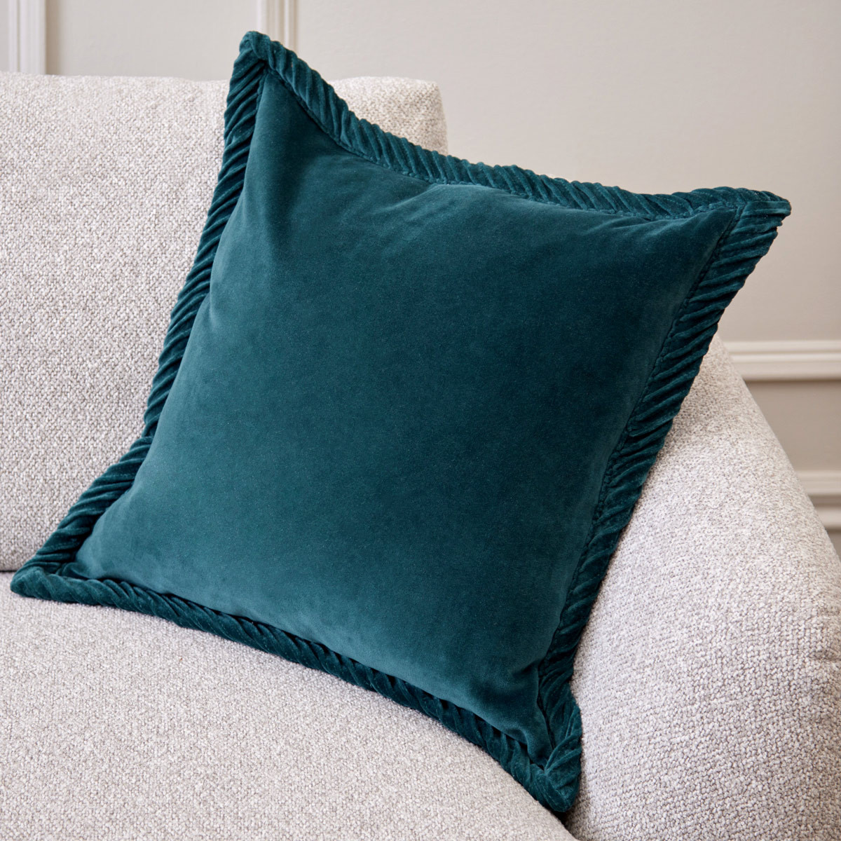 This Teal Baroque Border Velvet Cushion showcases a striking Baroque-style border in a rich teal colour. Its luxurious velvet fabric brings elegance and depth, making it a standout accent for any room.