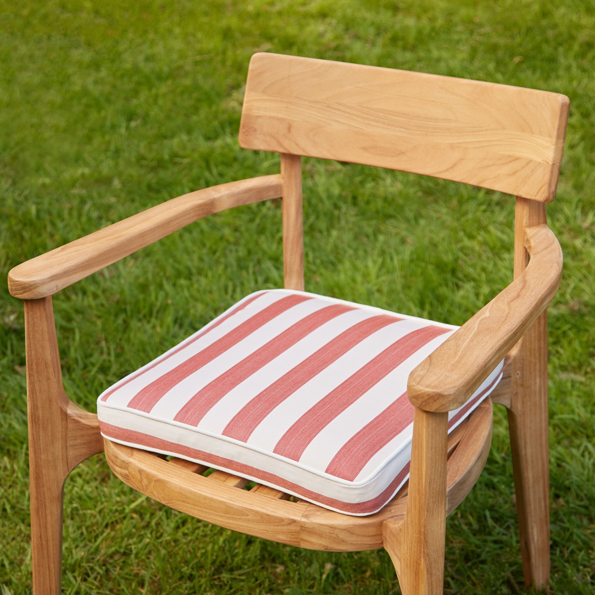 With its bold terracotta and white stripes, this outdoor seatpad adds colour and comfort to wooden, metal, or rattan chairs. The soft cushioning makes it ideal for long lunches or evening gatherings outside. Seatpad is weather-resistant.