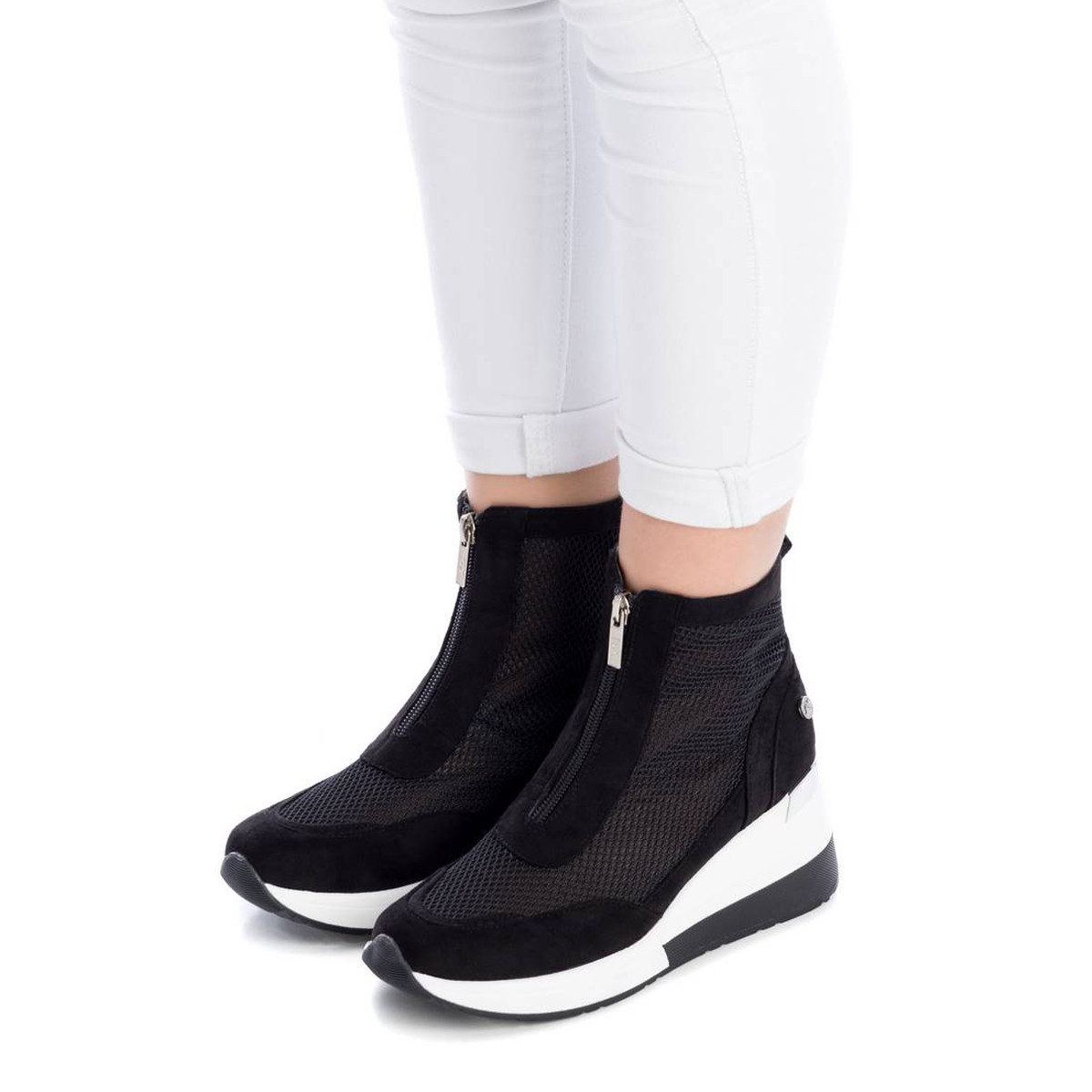 These sporty sock boots will be a firm favourite on your feet. In a mix of mesh fabric and faux suede, these boots have a metal zip closure with 7 cm wedge heel and non-slip rubber sole. These two-tone boots have metallic touches to add interest. Style with wide leg trousers, a shirt and a blazer for a smart casual office look or pair with a midi dress and biker jacket for an edgy look. This model has been certified vegan by the world organization PETA (Organization for Animal Rights).