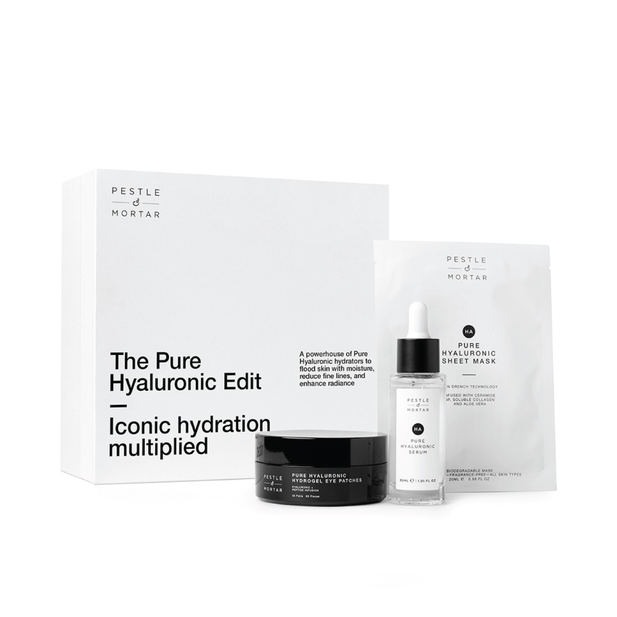 The Pestle & mortar Pure Hyaluronic Edit is a powerhouse of hydrators to flood skin with moisture, reduce fine lines, and enhance radiance.